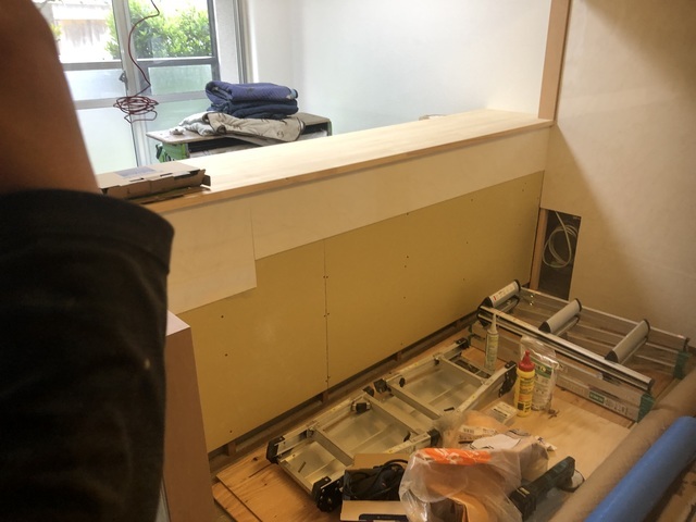 壁の造作をしてシステムキッチンを設置しました。テレビを見ながら料理が出来るようになりました。